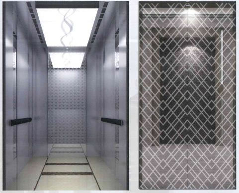 轎壁:后壁中間鏡面蝕刻兩側(cè)鏡面噴砂不銹鋼,側(cè)壁中間鏡面蝕刻兩側(cè)鏡面噴砂不銹鋼